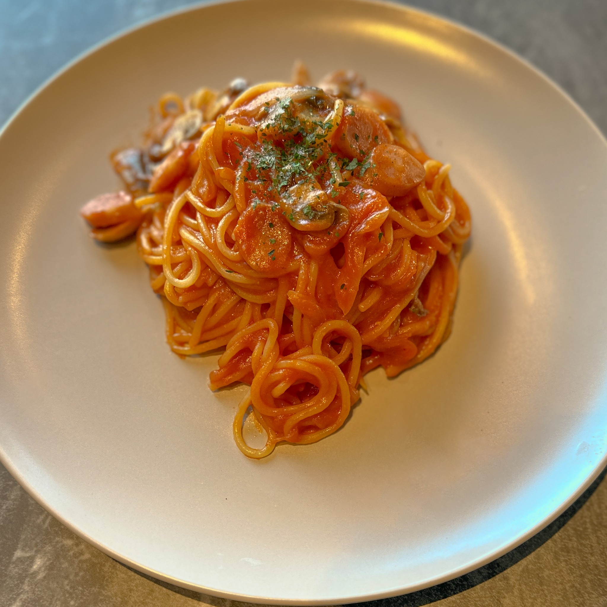 当店オリジナルの特製トマトソースに、マッシュルーム、ベーコン、ソーセージなど具沢山に仕上げております♪