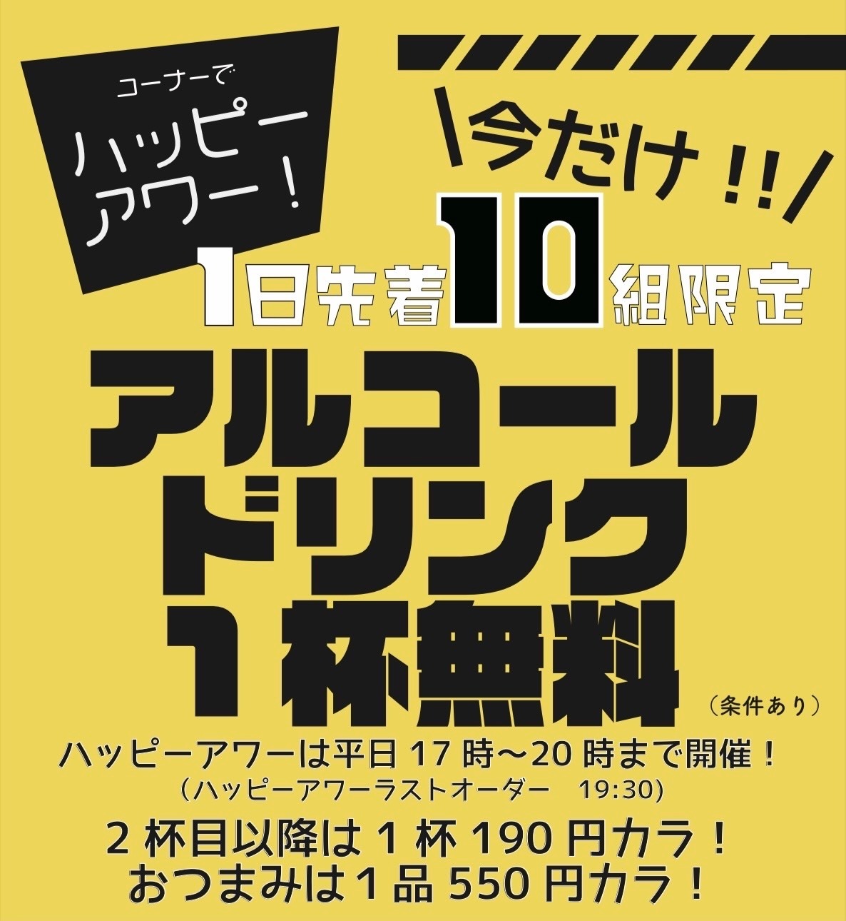 CORNERのハッピーアワーが今だけ期間限定特別価格★